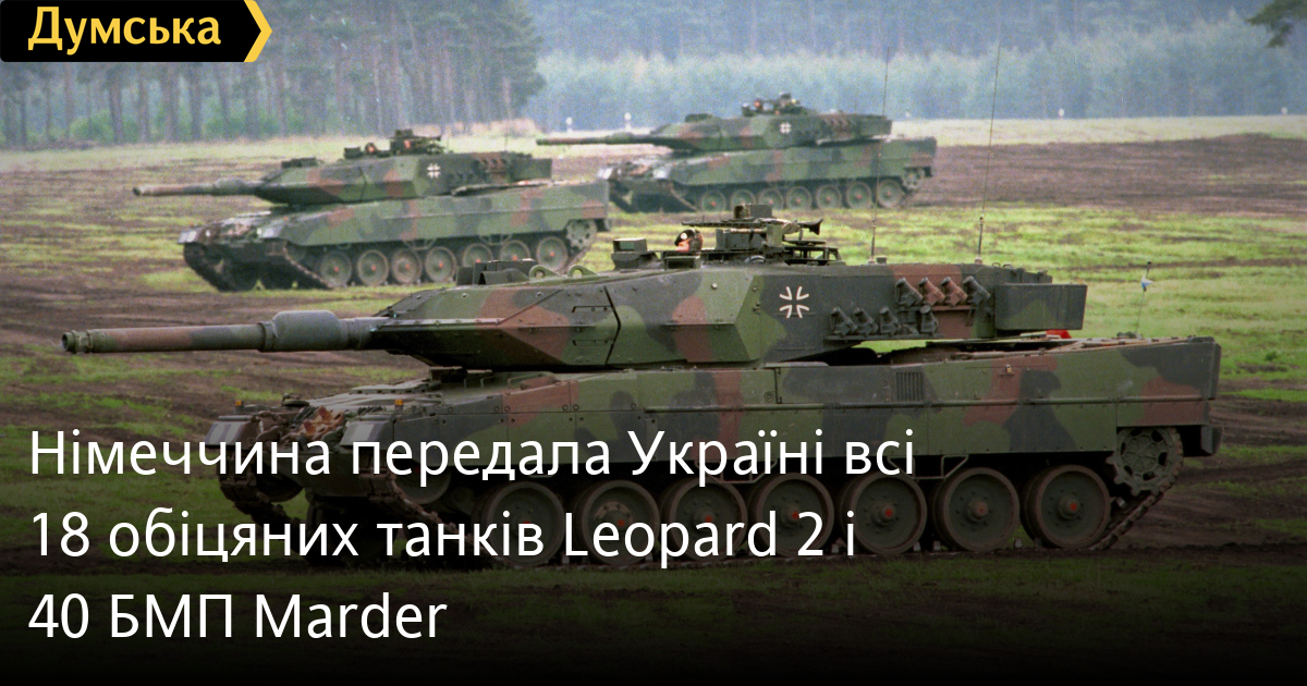 Німеччина передала Україні всі 18 обіцяних танків Leopard 2 і 40 БМП Marder18 танків Leopard 2, які в рамках танкової коаліції Німеччина обіцяла передати Україні, вже перебувають у нашій країні. Як повідомляє видання Der Spiegel, також відбулася передача 40 бойових броньованих машин Marder. Нагадаємо, напередодні стало відомо, що у Великій Британії українські танкісти завершили навчання на 14 танках Challenger, які будуть передані найближчим часом. Там же вже друга команда наших артилеристів закінчила вчитися керувати 155-мм артустановками AS-90. Раніше Польща вже передала в Україну кілька «Леопардів». Навчання українських танкістів на танках цього типу тривають у Польщі та Іспанії. У рамках танкової коаліції Україна має отримати близько 150 сучасних західних танків. Крім того, найближчим часом мають надійти американські БМП Striker. СМЕРТЬ РОСІЙСЬКИМ ОКУПАНТАМ! Помітили помилку? Виділяйте слова з помилкою та натискайте control-enter |
