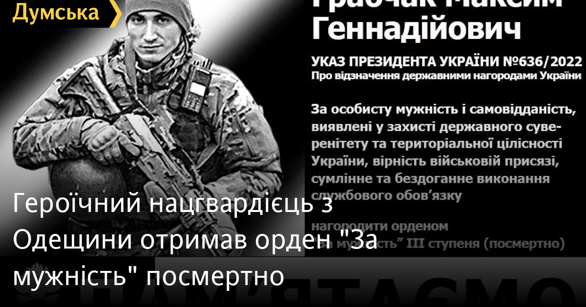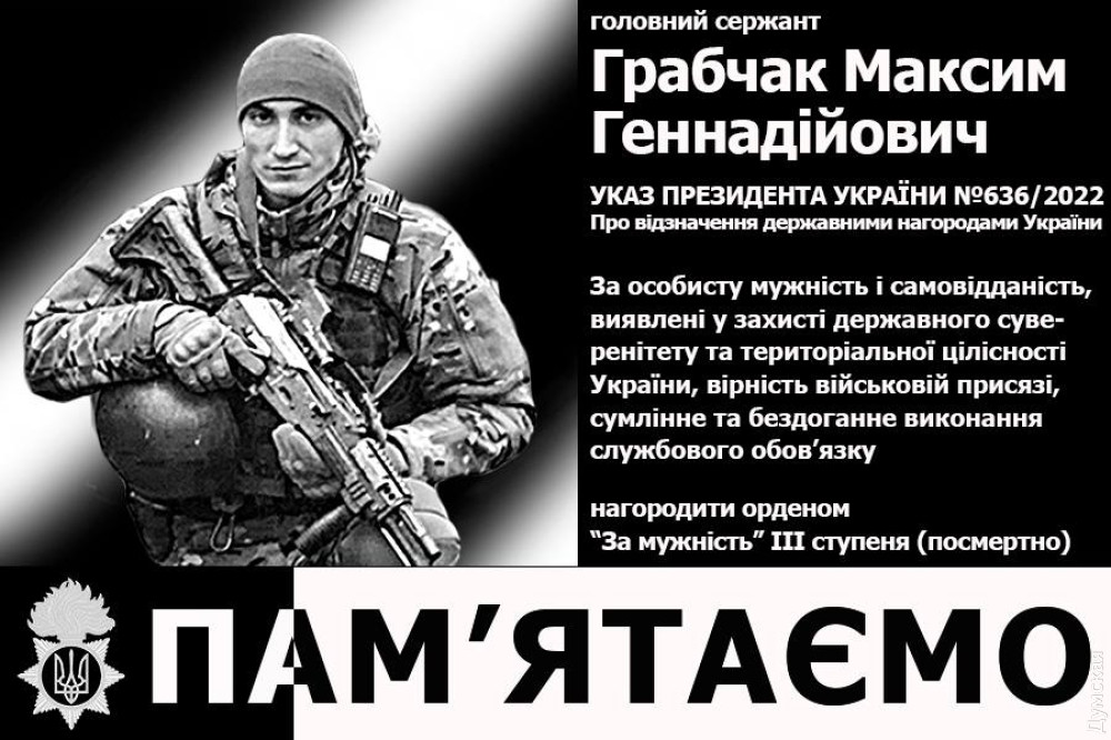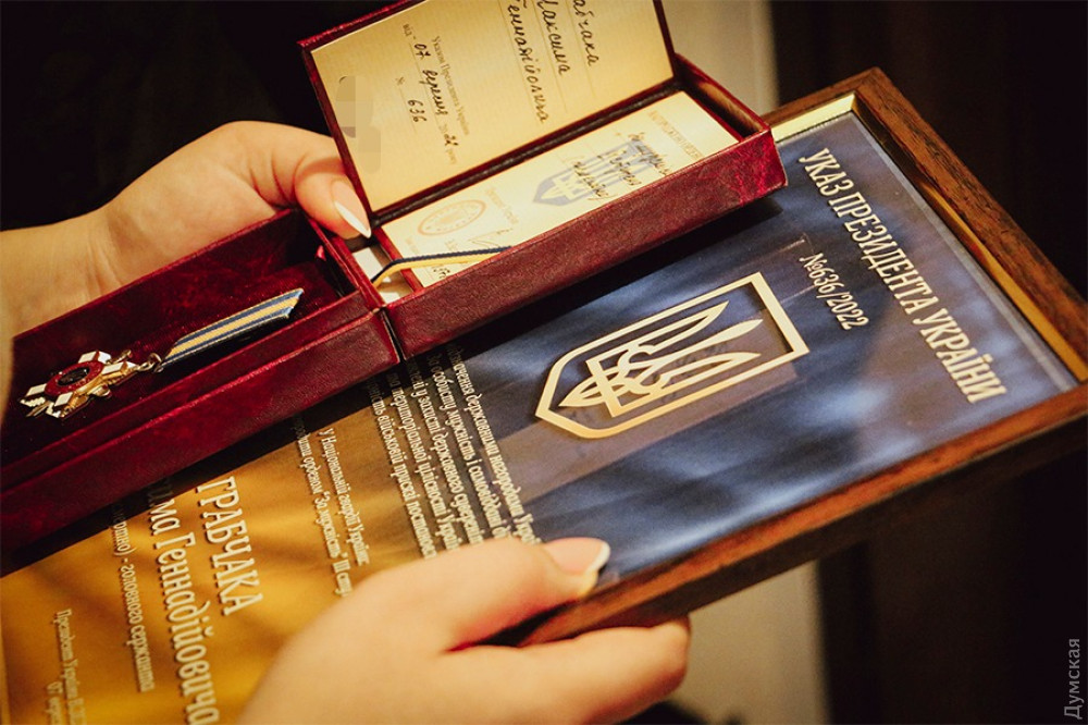 Дружина загиблого на фронті уродженця Одеської області, військовослужбовця Національної гвардії України Максима Грабчака отримала орден «За мужність» III ступеня, яким був посмертно нагороджений її чоловік.
