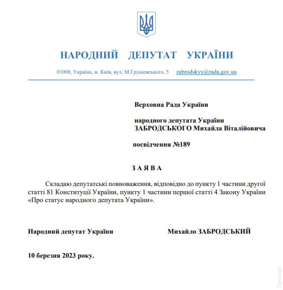 Проєкт постанови про дострокове припинення повноважень народного депутата від «Європейської Солідарності», Героя України Михайла Забродського зареєстрували у Верховній Раді.