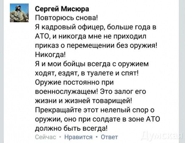 «Я больше года в АТО, и никогда мне не приходил приказ о перемещении без оружия! Я и мои бойцы всегда с оружием ездят, ходят, в туалете и спят».