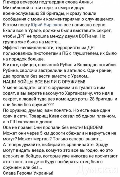 Военнослужащие 28-й отдельной гвардейской мехбригады, волонтеры и Генштаб опровергают распространенную рядом СМИ информацию о том, что погибшие 31 мая у н.п. Славное Донецкой области бойцы одесской части были безоружными.