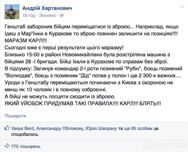 Но нет же, находится некто и начинается #зрада! Оказывается Генеральный Штаб дал приказ о разоружении собственной армии. Оказывается в зоне АТО нужно перемещаться без оружия. И сотни-сотни-сотни на автомате начинают вопить, начинают репостить. Третий Майдан собирали по этому поводу, нет?