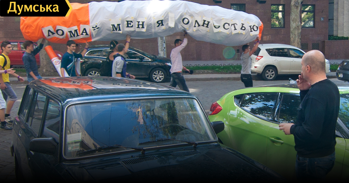 Её участники пронесли от Куликового поля к Дюку десятиметровую сигарету, наполненную шариками с гелием. На каждом было написано имя человека, который умер из-за курения. Возле памятника первому градоначальнику Одессы молодые люди сломали сигарету в знак отказа от курения, и шарики взлетели в небо.
