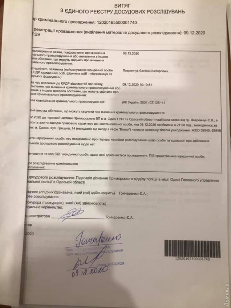 Полиция открыла по факту нападения на Евгения Лавренчука уголовное производство. Предварительная правовая квалификация — умышленное легкое телесное повреждение (часть 1 ст. 125 УК Украины).