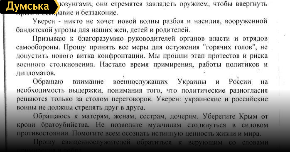 «Мы прошли этап протестов и риска военного столкновения. Настало время работы политиков и дипломатов. Обращаю внимание военнослужащих Украины и России на необходимость выдержки, понимания того, что политические разногласия решаются только за столом переговоров. Уверен: украинские и российские воины не должны стрелять друг в друга», — отмечается в обращении. «Обращаюсь к матерям, женам, сестрам, дочерям. Уберегите Крым от крови братоубийства. Не позвольте мужчинам столкнуться в силовом противостоянии. Помогите всем осознать истинную ценность жизни и мира», — добавил главнокомандующий.