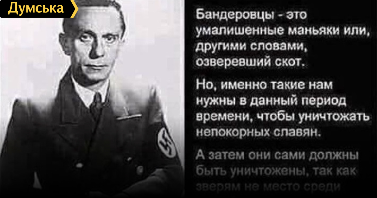 Председатель фракции «Оппозиционного блока» в Одесском облсовете Вадим Шкаровский снова порадовал читателей своей страницы в «Фейсбуке». Если в прошлый раз он поведал им, что все проблемы в стране — из-за евреев, то на днях решил процитировать одного из ближайших соратников Адольфа Гитлера — Пауля Йозефа Геббельса. Цитата касается страшных бандеровцев, которых Геббельс якобы считал «зверями». Судя по всему, Шкаровский полностью солидарен с нацистом. И в самом деле, разве может министр пропаганды Третьего Рейха говорить неправду?