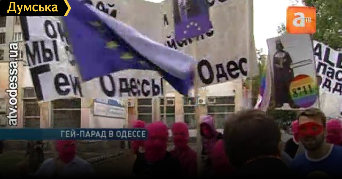 Очень интересно получается, а где же милиция была??? Когда Зоя Мельник бегает с малышом по пляжам с открытыми лицами милиция тут как тут. А когда люди в масках бегают по городу милиции близко нет. Или наша милиция тоже ратует за права гомосексуалистов? Надо этих митингующих привлечь к ответственности за несанкционированный митинг и клевету — СМИ будут в восторге от подробностей кто скрывался под масками))