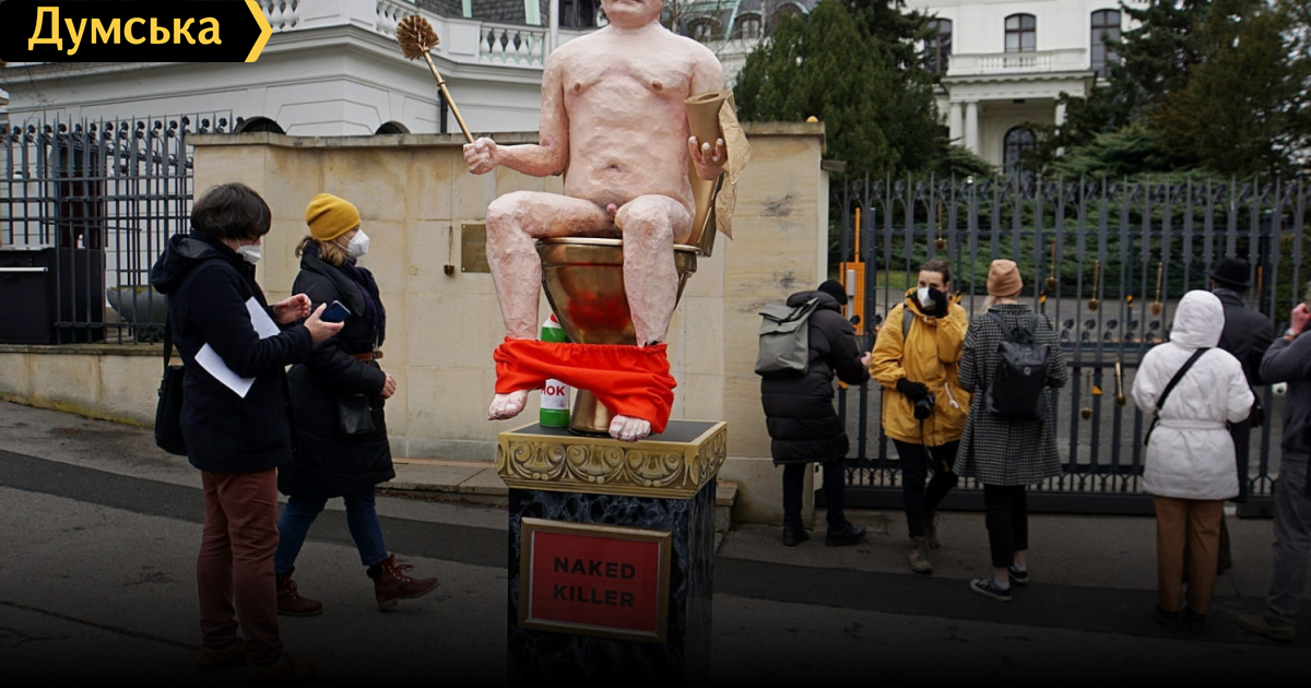 Голый Путин на золотом унитазе: перед зданием российского посольства в Чехии провели акцию в поддержку Навального и УкраиныЯркая акция протеста прошла сегодня днем под стенами Российского посольства в столице Чехии. Активисты организации Капутин, выступающие против заключения Алексея Навального и агрессивных действий Российской Федерации против Украины, установили перед воротами диппредставительства страны-агрессора золотой унитаз и посадили на него ростовую куклу, напоминающую Владимира Путина. Кроме того они украсили сами ворота посольства золотыми ершиками, как символом коррупции российской власти. «Этим перформансом мы хотим продемонстрировать свою поддержку простому народу в России и за рубежом, и солидарность с жертвами режима Путина, — отмечается в пресс-релизе организации. — Нынешний режим в России ворует у своих сограждан, жестко наказывая несогласных, лишая свободы, пытая и убивая тех, кто осмеливается критиковать власть». Участники акции потребовали от российского диктаторского режима освободить несправедливо осужденного Алексея Навального, предоставить доступ к нему врачей, освободить всех других политических узников, отвести войска от границы с Украиной и вывести их из оккупированных областей, а также отказаться от импорта российской вакцины «Спутник V». Фото — Антон Литвин, Капутин/Facebook СМЕРТЬ РОСІЙСЬКИМ ОКУПАНТАМ! Помітили помилку? Виділяйте слова з помилкою та натискайте control-enter |