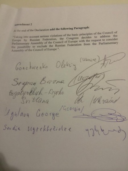 «По моему предложению, мы, группа делегатов от Украины и Грузии (я, Степан Барна, Светлана Богатырчук-Кривко, мэр Тбилиси Гиги Угулава и Севдия Угрехелидзе) предложили исключить Россию из Парламентской Ассамблеи Совета Европы», — пишет Гончаренко в своем блоге.