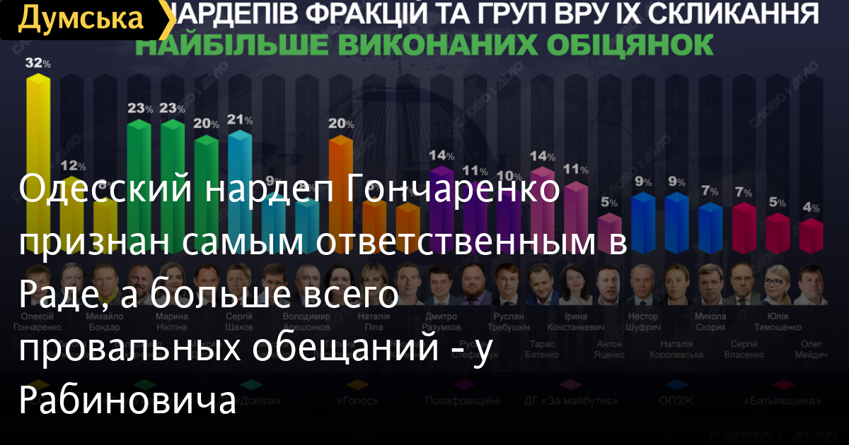 Алексей Гончаренко выполнил 32% своих обещаний, по этому показателю он лидирует не только в своей фракции, но и во всем парламенте, причем с солидным отрывом от других.