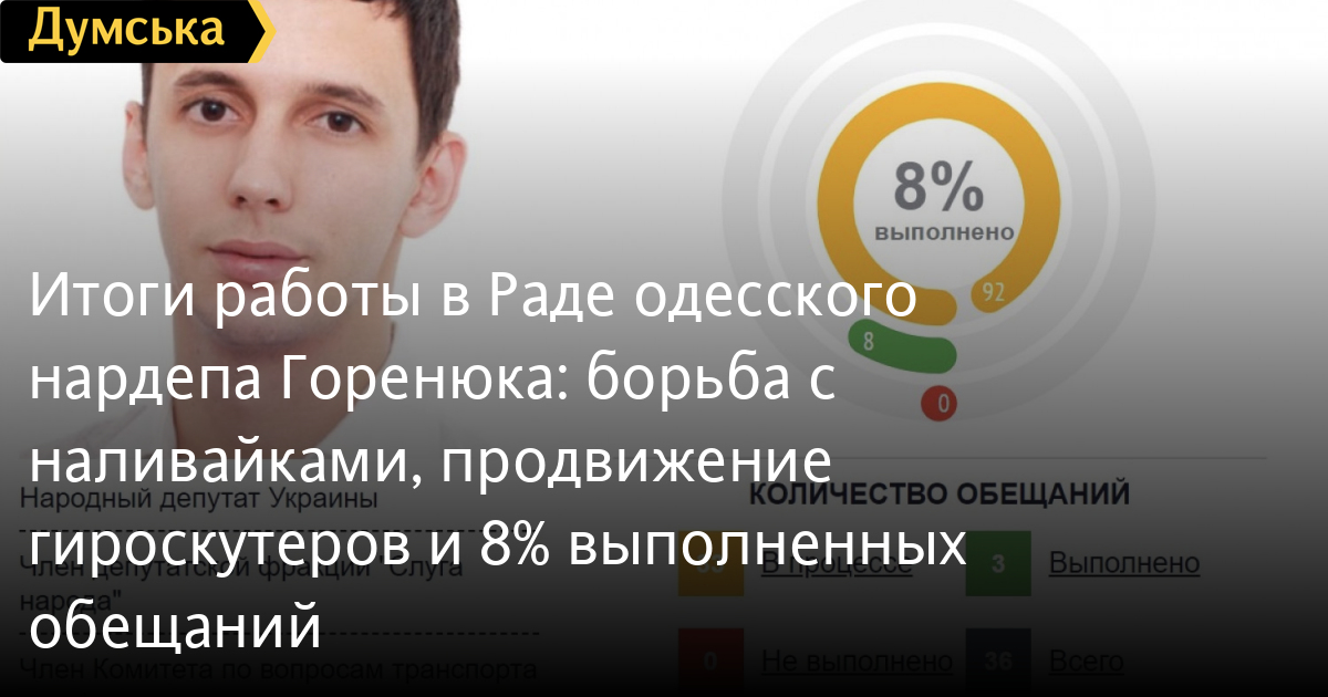 По информации сайта «Слово и Дело» Горенюк выполнил всего 8% предвыборных обещаний — поддержал законы о незаконном обогащении чиновников и конфискации активов, а также проголосовал за аудит безопасности автомобильных дорог.