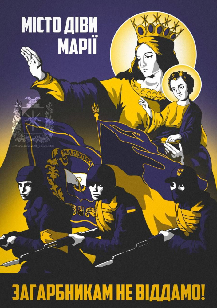 Но местным жителям, которые сейчас героически отстаивают свой блокадный город и выживают под чуть ли не ежечасными обстрелами, без нормального питания и воды, без лекарств, насколько мне известно, нравится третья гипотеза – что Мариуполь (то есть на слегка искаженном греческом «город Марии») при рождении был посвящен Пресвятой Деве Марии и передан под ее защиту. И сейчас образ Богородицы используется даже на военных плакатах.