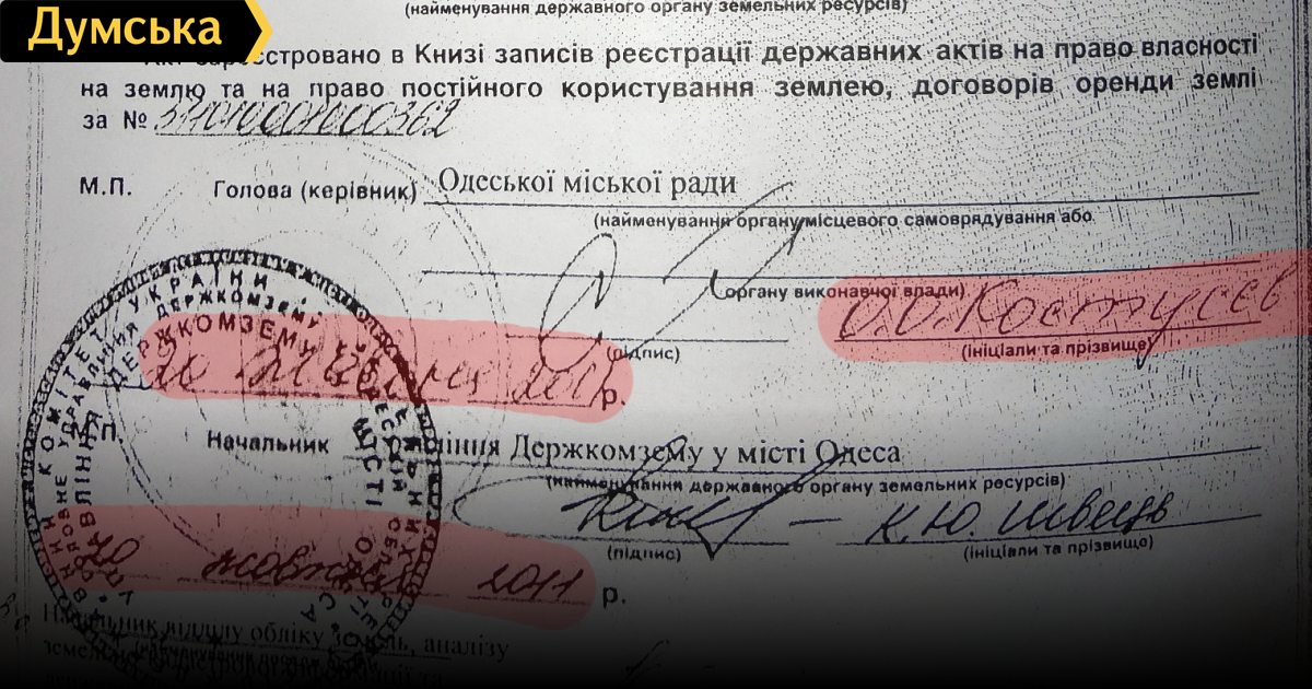 20 октября Алексей Костусев собственноручно подписывает госакты на участки. В этот же день на документах появляется подпись начальника регионального Госкомзема. Юристы рассказали «Думской», что, в соответствии с законодательством, на выдачу госактов должно уходить не больше месяца, однако это первый случай в их практике, когда от решения выделить землю до непосредственного выделения земли проходит столь короткий срок. «Как правило, этот процесс тормозят сами чиновники. Во-первых, эти люди выполняют всю работу в порядке очереди, а очереди, поверьте, у них немалые. Во-вторых, земельные чиновники ожидают некого вознаграждения за их «труды» по подготовке документов и могут не выдавать акт на землю, пока его получатель сам не поймет, чего от него хотят, — рассказывает одесский юрист Антон Брунов, — Волокита в земельных инстанциях может тянуться несколько месяцев — зачастую, около полугода».