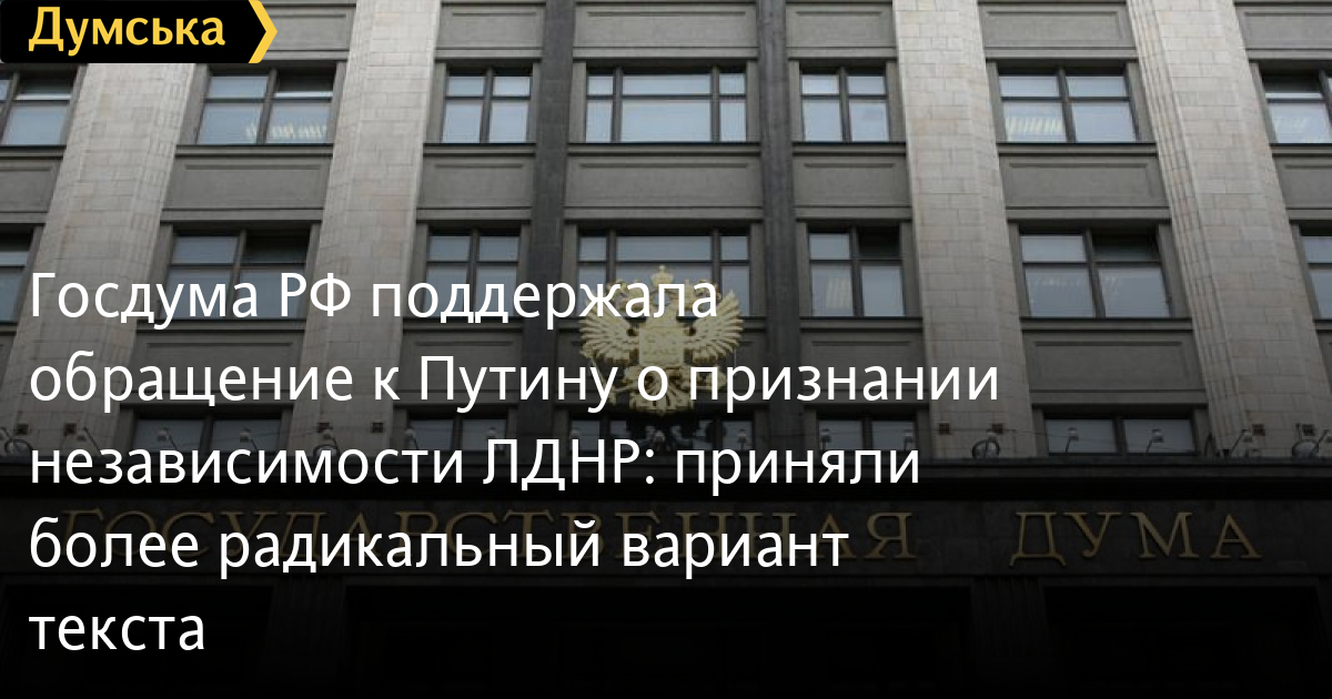 Депутаты государственной думы Российской Федерации 15 февраля приняли обращение к президенту Владимиру Путину с предложением признать независимость «ДНР» и «ЛНР».