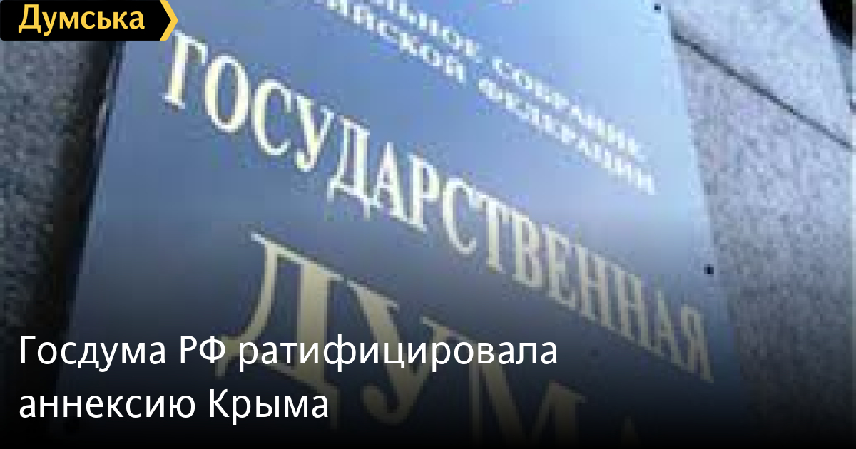 Государственная Дума Российской Федерации утвердила федеральный конституционный закон «О принятии в состав Российской Федерации Республики Крым и образовании в составе РФ новых субъектов — Республики Крым и города федерального значения Севастополя».