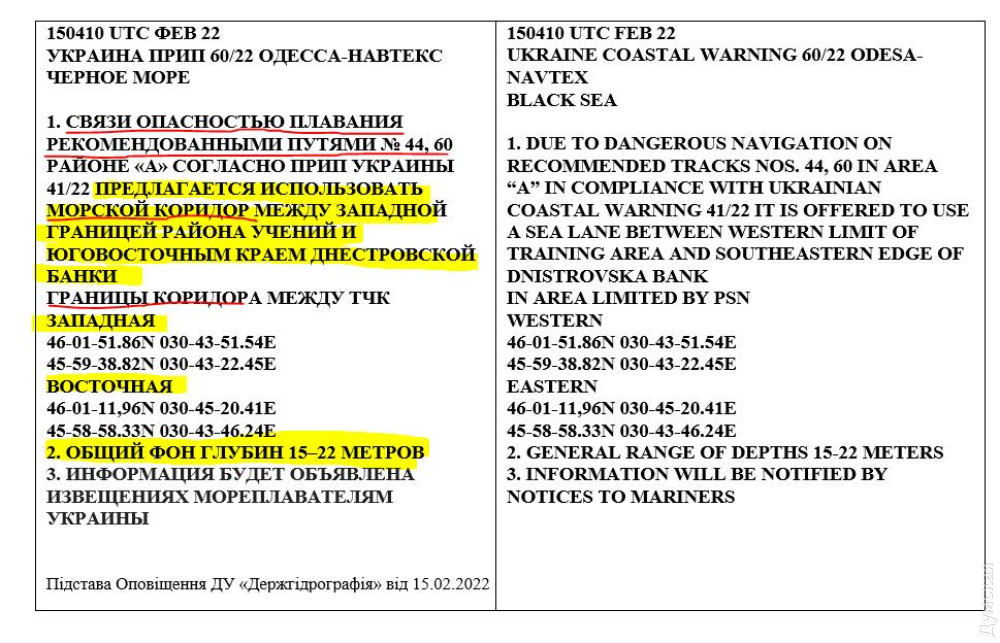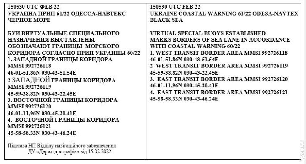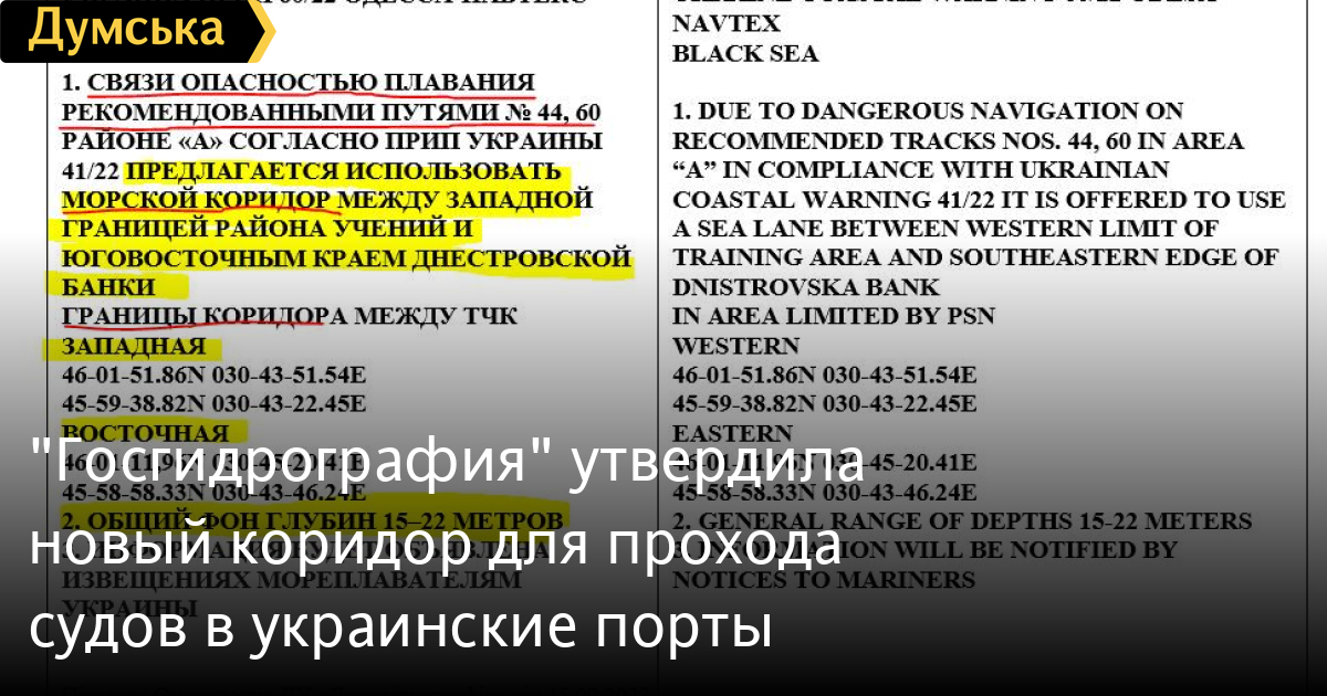 ГП «Госгидрография» опубликовало документ с координатами нового коридора для прохода судов в черноморские порты Украины.