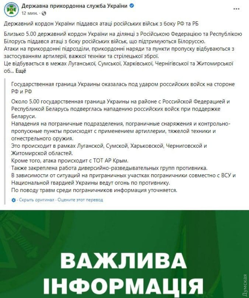 Как сообщили в Госпогранслужбе, примерно в 5:00 государственная граница нашей страны на участке с РФ и РБ подверглась атаке со стороны российских войск, которые поддерживаются белорусской армией.