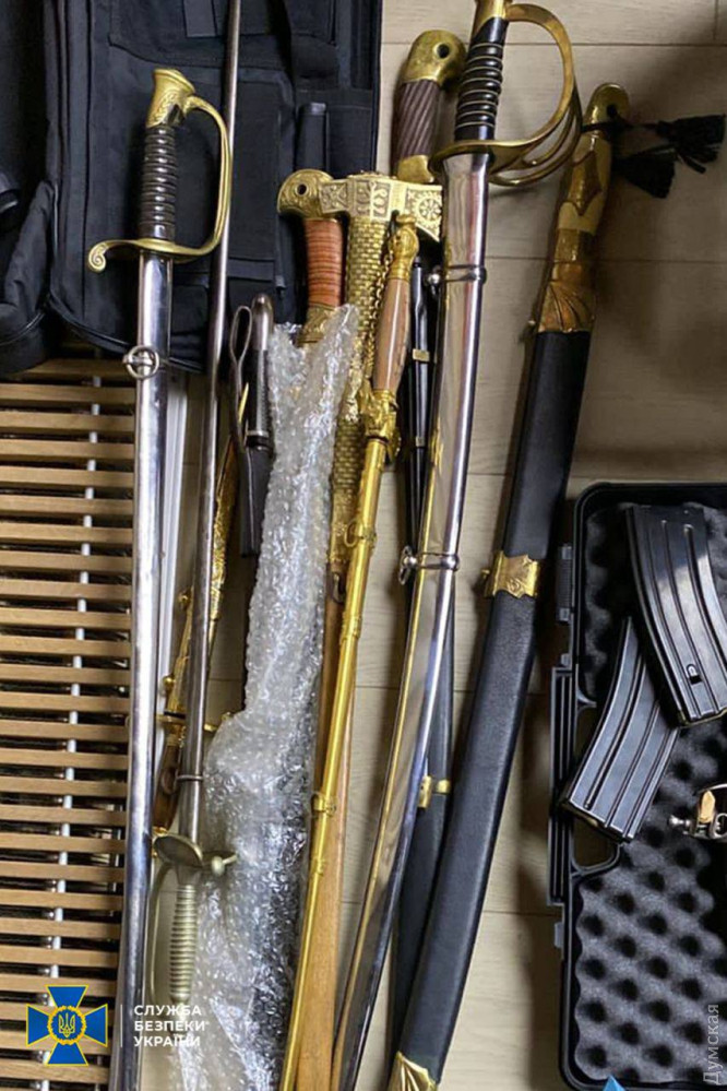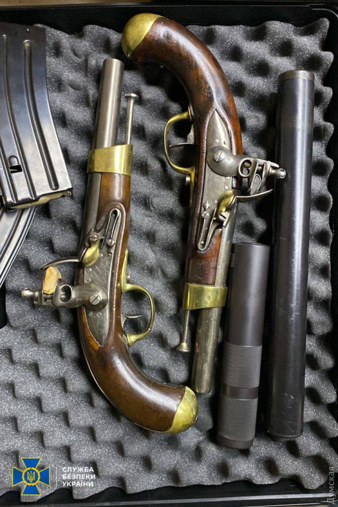 Крім того, під час обшуків у столичній квартирі фігуранта виявлено 13 одиниць зброї, у тому числі колекційної, понад 5,6 тис. набоїв, мобільні телефони, комп’ютери, документи та чорнові записи із доказами протиправної діяльності.