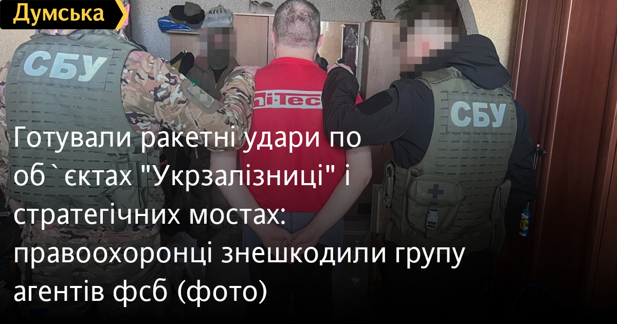 Агентурну групу фсб, яка готувала ракетні удари по об’єктах «Укрзалізниці» і складах з боєприпасами, а також підбирала кадри в адміністрації окупантів, знешкодили правоохоронці в результаті спецоперації у Харківській та Донецькій областях.
