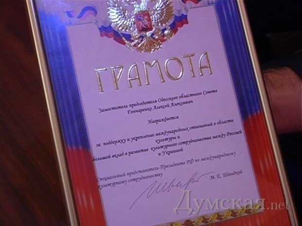 Деятельность одесского политика Алексея Гончаренко в сфере культурного сотрудничества между Украиной и Россией была отмечена на государственном уровне.