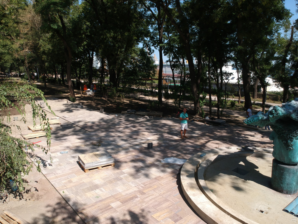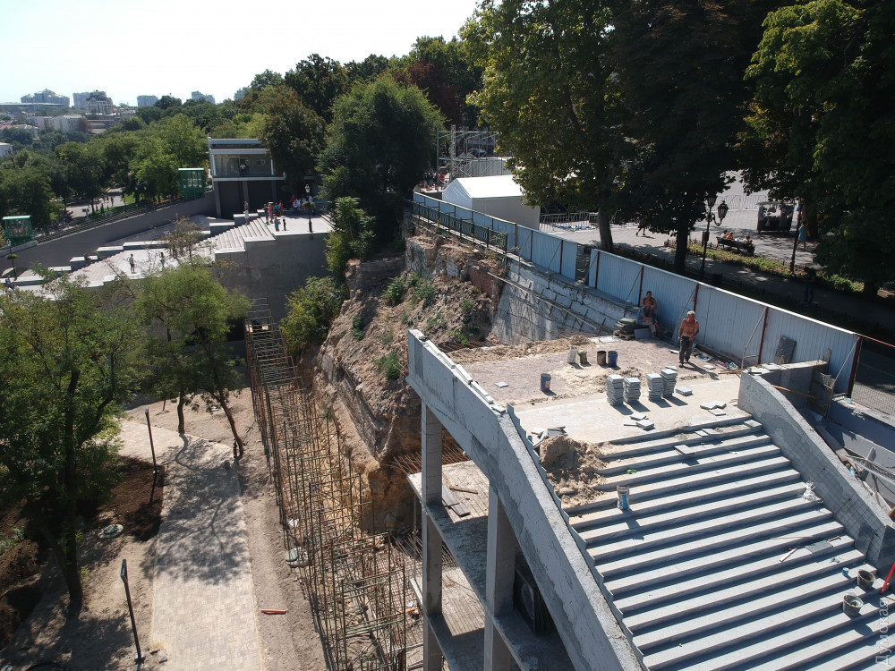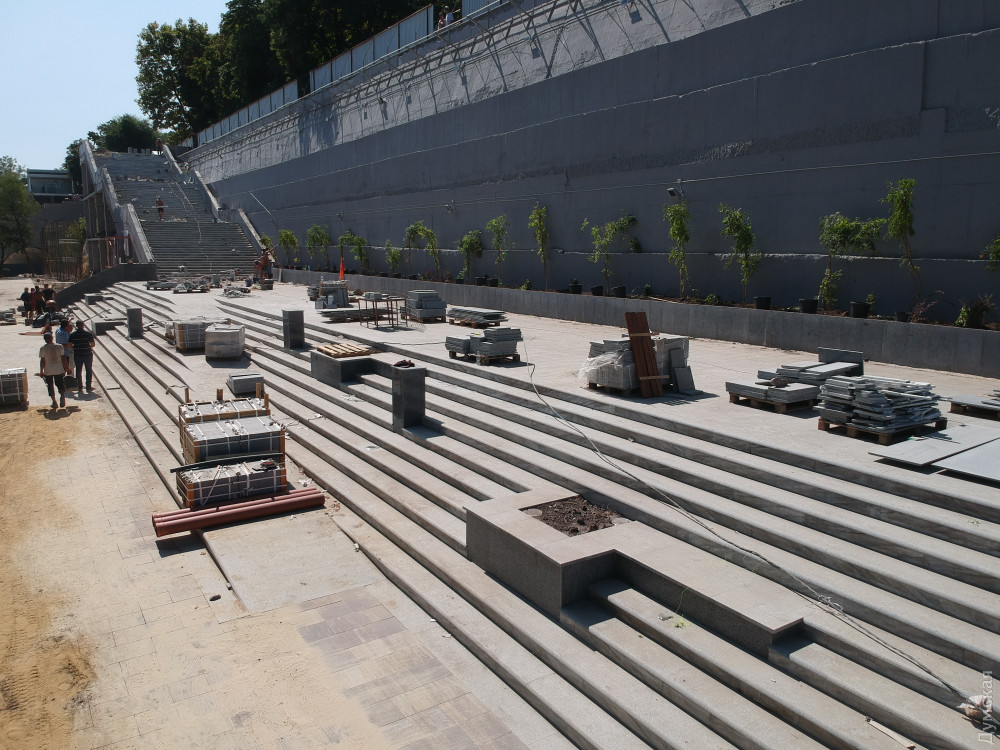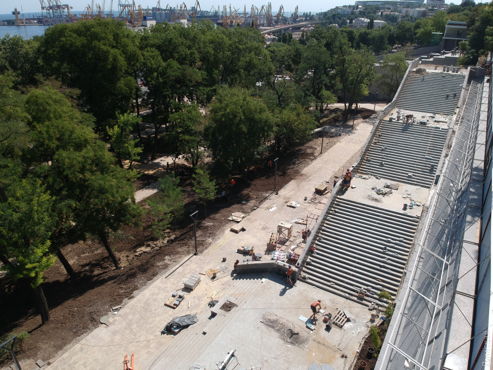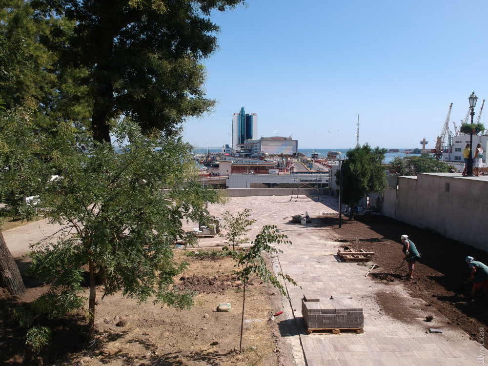 Две лестницы, ведущие с Приморского бульвара, почти закончили и сейчас их облицовывают гранитом. Установлен лифт для людей с ограниченными возможностями. «Зелентрестовцы» посадили новые деревья и занимаются укладкой газона.