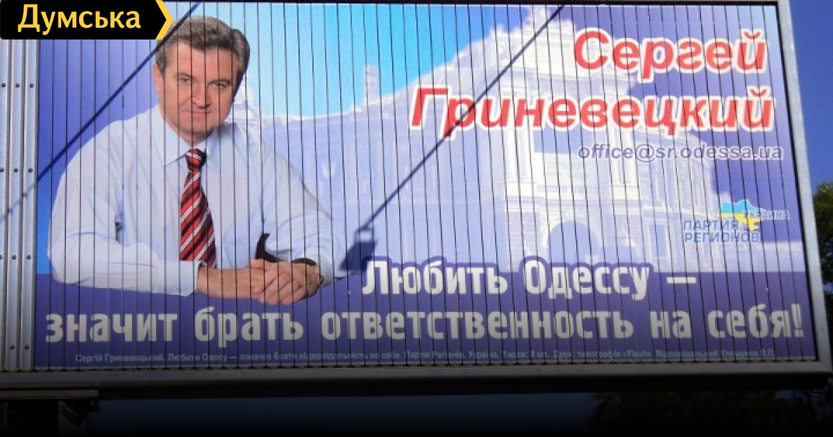 В Одессе появились билборды, на которых изображен кандидат в депутаты по Малиновскому району города Сергей Гриневецкий на фоне логотипа Партии регионов. Как известно, Гриневецкий является членом Народной партии, а также, будучи действующим депутатом Верховной Рады, входит в состав фракции блока Литвина.