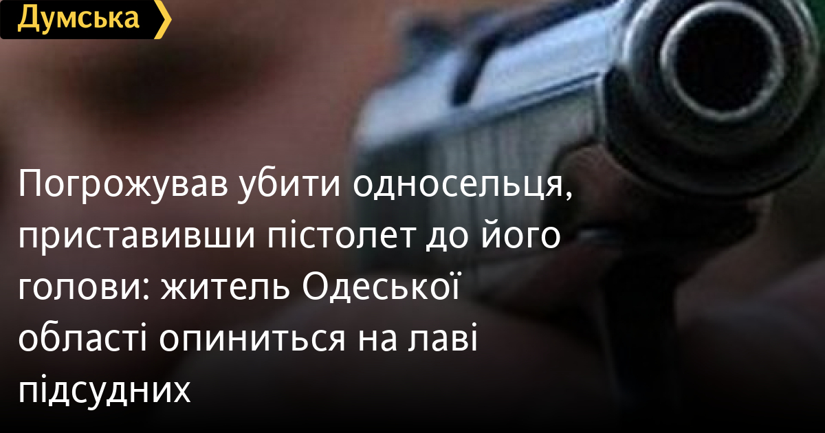 Погрожував убити односельця, приставивши пістолет до його голови: житель Одеської області опиниться на лаві підсуднихПеред судом за погрози вбивством своєму односельчанину постане житель Подільського району. Як повідомили у пресслужбі поліції Одеської області, двоє чоловіків посварилися під час спільного розпивання алкоголю, після чого конфлікт переріс у бійку. Один із них пішов і через деякий час повернувся з пістолетом. Він вистрілив у землю, а потім схопив опонента за шию і, приставивши пістолет, погрожував убити його. Сварку вдалося припинити завдяки втручанню іншого жителя села, але потерпілий злякався і звернувся до поліції. Правоохоронці вилучили в хулігана стартовий пістолет і повідомили йому про підозру за ч. 1 ст. 129 Кримінального кодексу України. Санкція статті передбачає покарання у вигляді арешту на строк до шести місяців або обмеження волі на строк до двох років. Обвинувальний акт скерували до суду. Помітили помилку? Виділяйте слова з помилкою та натискайте control-enter Новини по цій темі: 29 липня 2025: В Усатово Одеської області сталася перестрілка: поліція працює на місці (відео, оновлено) 28 липня 2025: П'яний на "Ягуарі" або гіпертонік? Звільнений топ-посадовець одеської поліції хоче повернутися на службу 19 червня 2025: Дівчинку, яку шукали сотні одеситів, знайшли вбитою: поліція працює з чоловіком, ймовірно причетним до загибелі 27 травня 2025: Увели гектар в університету: на Одещині засудили земельних аферистів, але без посадки і Хвоста |