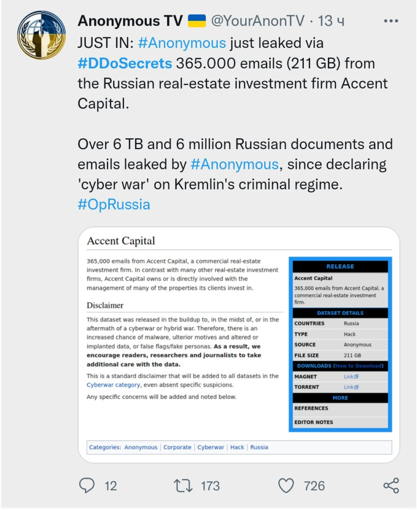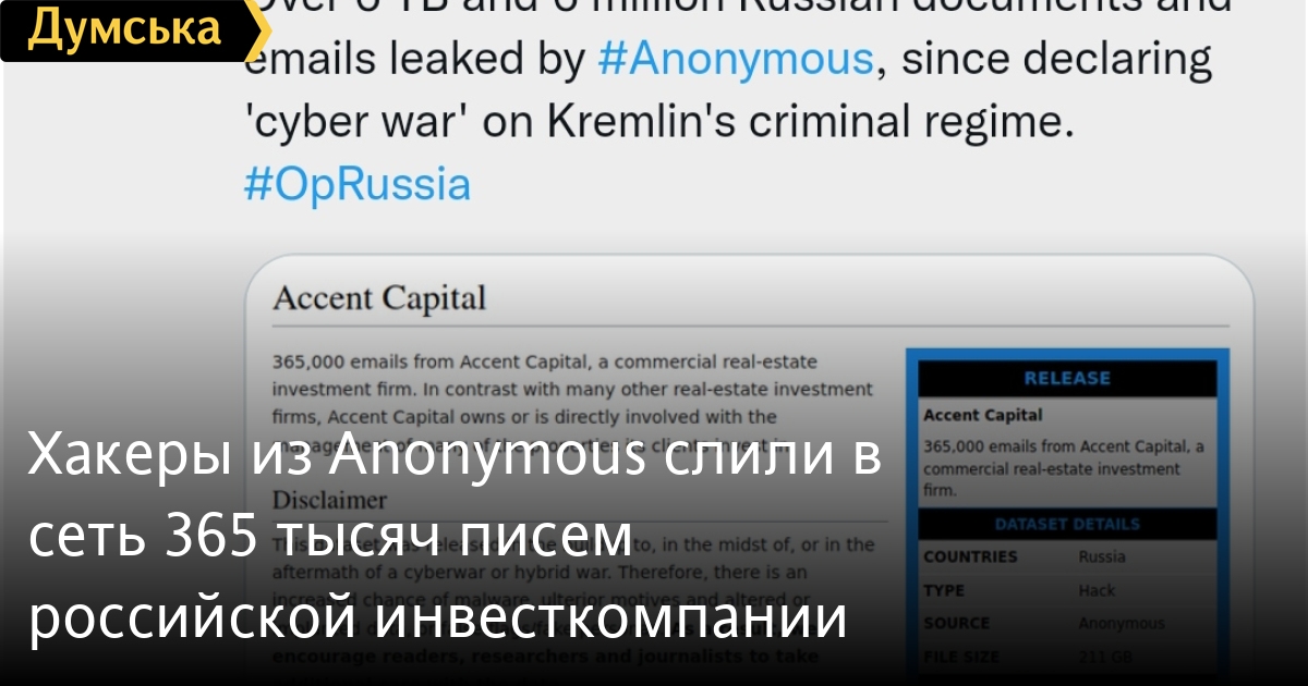 Хакеры-активисты из группы Anonymоus выложили в сеть 365 тысяч писем российской инвестиционной компании Accent Capital.