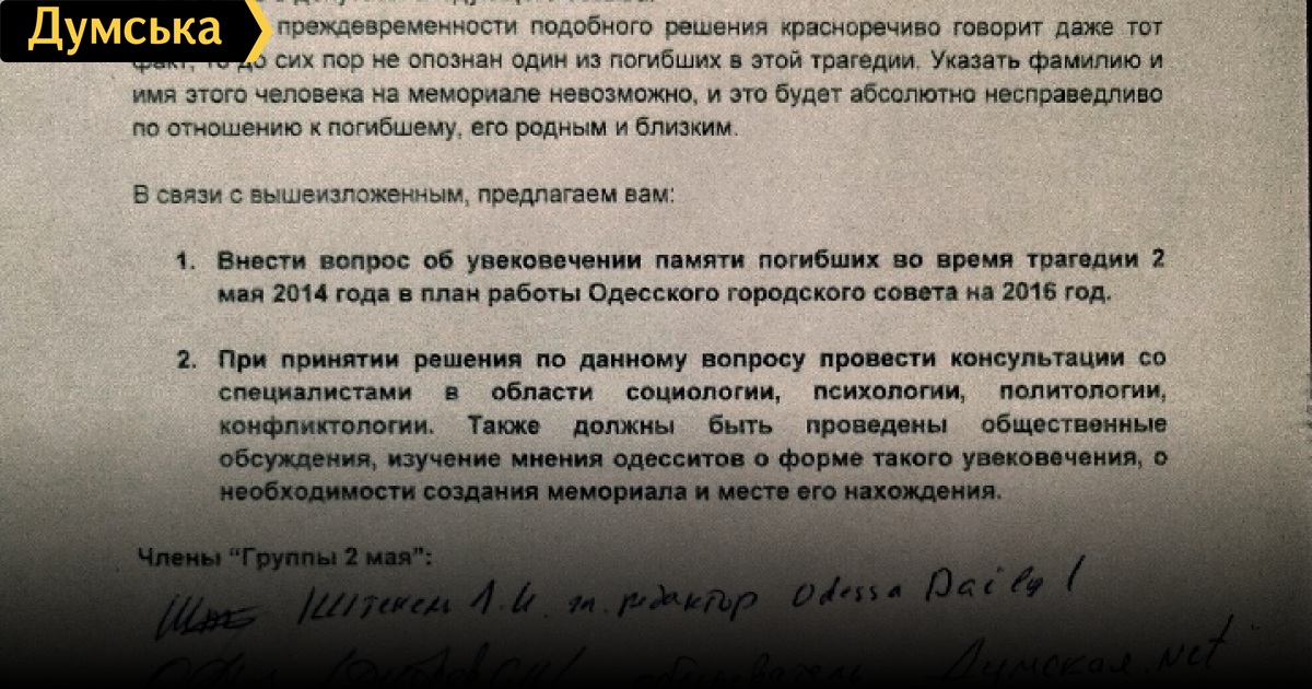 «Группа 2 мая» обратилась к депутатам с призывом отложить рассмотрение вопроса об увековечивании памяти погибших 2 маяЧлены журналистско-экспертной «Группы 2 мая» обратились к городскому голове Геннадию Труханову и депутатам горсовета с призывом отложить рассмотрение вопроса о строительстве мемориала погибшим в результате трагических событий прошлой весны. Члены группы, которые уже больше года ведут собственное расследование, общаются с очевидцами, родственниками погибших и обнародовали ряд документов, проливающих свет на причины и обстоятельства трагедии, навали несколько причин, по которым считают такое решение преждевременным и неуместным. По мнению подписантов, мемориальный объект может появиться только после окончания уголовного расследования и всех судебных процессов. На данный момент ни одно уголовное дело по событиям 2 мая не рассмотрено, а по эпизоду на Куликовом поле продолжается досудебное следствие. Вопрос о строительстве памятника необходимо поднимать только после проведения независимого социологического опроса на тему необходимости создания мемориала и форм воплощения этой идеи. Без этого он не будет способствовать установлению мира, а будет источником напряженности и объектом вандализма. Авторы обращения обращают внимание на то, что вопрос о создании мемориала выносится на сессию горсовета за 5 месяцев до выборов в местные органы власти. Больше года городские власти не издали ни единого звука по этому поводу, и только сейчас, накануне избирательной кампании, решили дать оценку тем событиям: «Сегодня такой шаг будет однозначно расцениваться как предвыборная манипуляция и «политтехнология на крови». Даже такое подозрение в очередной раз ударит по репутации и уровню доверия к городской власти. Если же такая попытка действительно имеет место, то это - предел цинизма со стороны потенциальных кандидатов в депутаты следующего созыва», — сказано в обращении. Члены «Группы 2 мая» напоминают, что депутаты и чиновники нынешнего состава горсовета лично участвовали в политических акциях, митингах и демонстрациях противоборствующих сторон. 24 января 2014 года большинство депутатов проголосовало за обращение к Януковичу с требованием «навести порядок». Поэтому нынешний депутатский корпус несет как минимум политическую ответственность за последовавшие события как в Киеве, так и в Одессе. Для «Группы 2 мая» очевидно, что моральное право давать политические оценки и принимать решения об увековечении памяти погибших имеют только депутаты следующего созыва. Обращение к городским властям, которое официально передано в мэрию, подписали 9 из 13 членов группы: Леонид Штекель, Владимир Саркисян, Светлана Подпалая, Сергей Дибров, Владислав Сердюк, Татьяна Герасимова, Владислав Балинский, Павел Паламарчук, Юрий Весилык. Главный редактор «Таймера» Юрий Ткачев отказался ставить свою подпись. СМЕРТЬ РОСІЙСЬКИМ ОКУПАНТАМ! Помітили помилку? Виділяйте слова з помилкою та натискайте control-enter
