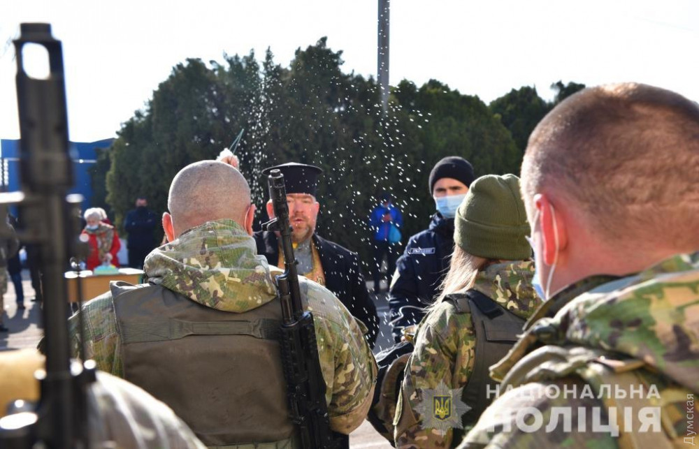 Ротация полицейских спецподразделения прошла сегодня. Их провожало руководство одесской полиции, родные, коллеги, волонтеры и представители духовенства.