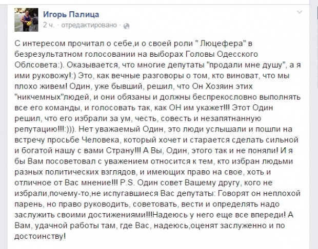 Губернатор Одесской области Игорь Палица на своей страничке в Facebook прокомментировал недавнее голосование по выборам председателя облсовета.