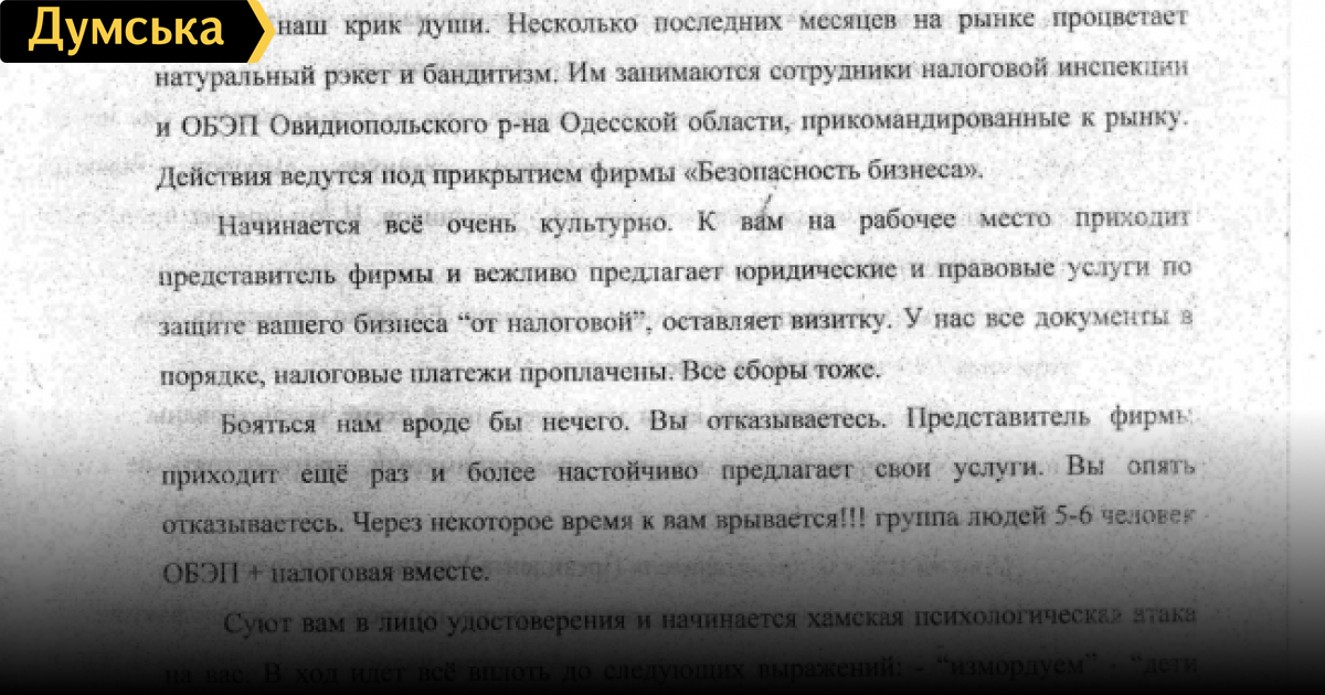 В документе торговцы описывают, как их принуждают заключать договоры с фирмой под названием «Безопасность бизнеса», по которым потом приходится платить тысячи гривен. Под обращением поставили подписи около100 предпринимателей.