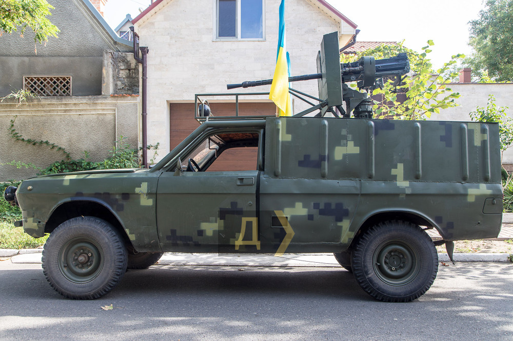 Першим дітищем «гаража» став справжнісінький Gun truck – монструозний пікап, оснащений великокаліберним кулеметом КПВТ, що ніби зійшов з екрану фільму «Дорога люті», тільки не чорний, а болотяного камуфляжного кольору.