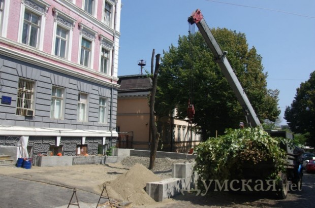 Как сообщили «Думской» источники в надзорном ведомстве, объект, который сооружают рабочие из бетонных блоков, будет служить временным хранилищем для песка и гравия. «Это делается для того, чтобы не загрязнять Дерибасовскую», — сказал наш собеседник, добавив, что «липу обрезали с разрешения «Зелентреста» и ей ничего не грозит».