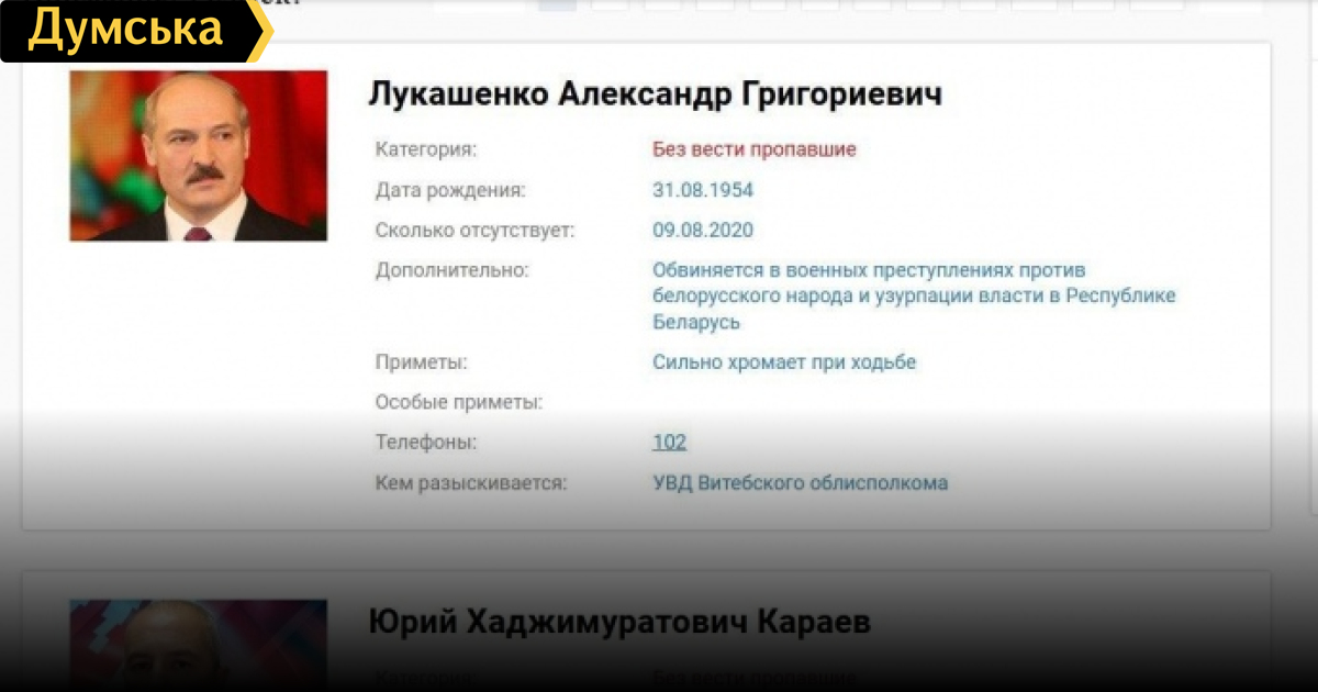 Неизвестные хакеры взломали сайт Министерства внутренних дел Беларуси и объявили в розыск диктатора Александра Лукашенко, который сейчас исполняет обязанности президента страны. Об этом сообщил Telegram-канал «Наша Нива». На сайте Лукашенко и глава МВД Беларуси Юрий Караев значатся «пропавшими без вести». Также указано, что Лукашенко «обвиняется в военных преступлениях против белорусского народа и узурпации власти в Республике Беларусь». Напомним, после президентских выборов в Беларуси не прекращаются мирные забастовки против фальсификации результатов голосования, по которым Лукашенко якобы набрал 80% голосов. Люди требуют его отставки и проведения новых прозрачных выборов в присутствии независимых наблюдателей. Силовики регулярно разгоняют протестующих, используя слезоточивый газ, дубинки, задерживают сотни людей и издеваются над ними. СМЕРТЬ РОСІЙСЬКИМ ОКУПАНТАМ! Помітили помилку? Виділяйте слова з помилкою та натискайте control-enter Новини по цій темі: 9 серпня 2021: Лукашенко защитил Зеленского в ситуации с вагнеровцами: «Кто-то из негодяев их туда отправил, но мы остались с ними друзьями» 3 серпня 2021: В Одессе почтили память белорусского оппозиционера, найденного повешенным в киевском парке (фото, видео) |