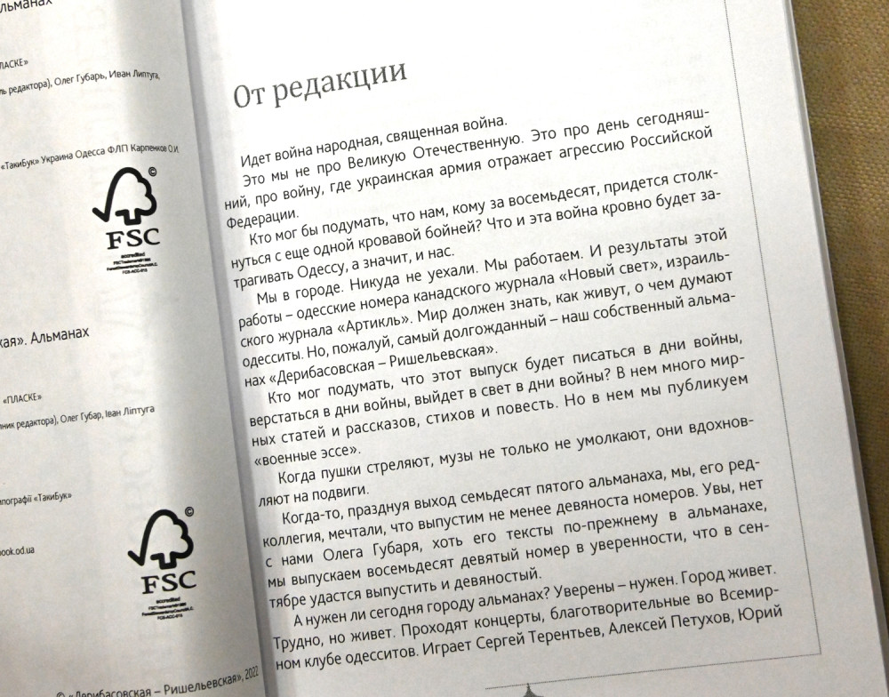 «Мы в городе. Никуда не уехали. Мы работаем. И результаты этойработы – одесские номера канадского журнала «Новый свет», израильского журнала «Артикль». Мир должен знать, как живут, о чем думаютодесситы. Но, пожалуй, самый долгожданный – наш собственный альманах «Дерибасовская – Ришельевская». Кто мог подумать, что этот выпуск будет писаться в дни войны, верстаться в дни войны, выйдет в свет в дни войны? В нем много мирных статей и рассказов, стихов и повесть. Но в нем мы публикуем «военные эссе». Город живет. Трудно, но живет. Проходят концерты, благотворительные во Всемирном клубе одесситов. Играет Сергей Терентьев, Алексей Петухов, Юрий Дикий, все деньги директор клуба Григорий Барац передает на бронежилеты для нужд обороны. Работают картинные галереи, репетируют театры. И новая книжка найдет своего читателя. Тем более что она традиционно составлена:от нашей классики – Михаила Жванецкого и Юрия Михайлика – до юмористического раздела. И еще раз можно будет подтвердить, что на войне слово – тоже острое оружие», — утверждает главный редактор альманаха Феликс Кохрихт.
