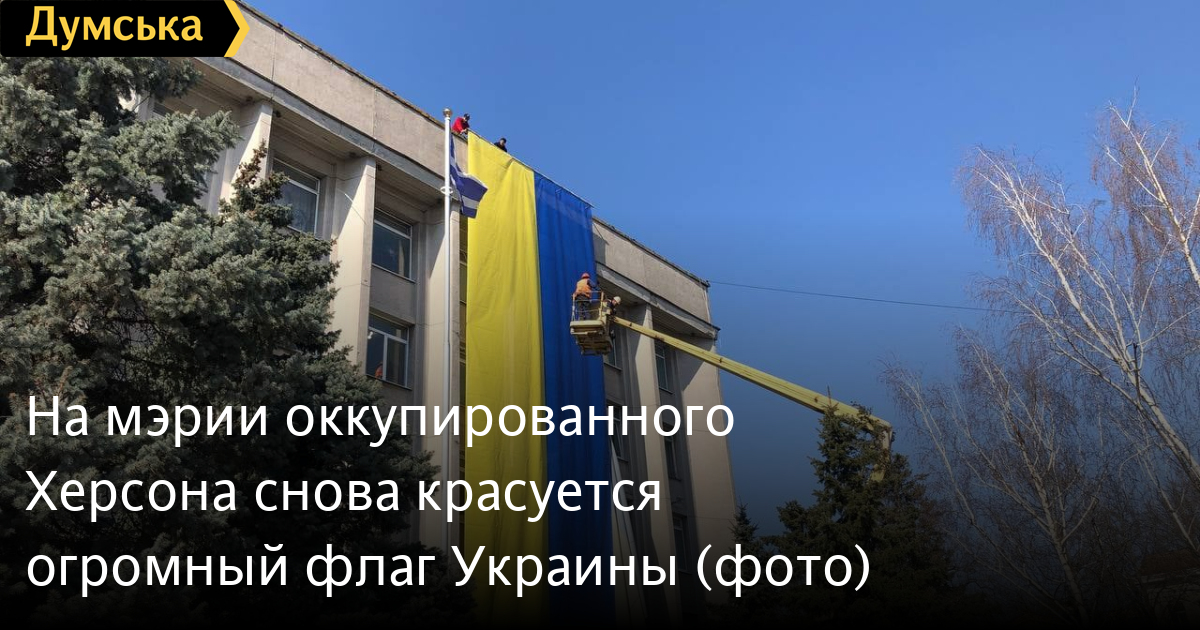 Огромный флаг Украины снова украшает стены горсовета временно оккупированного Херсона.