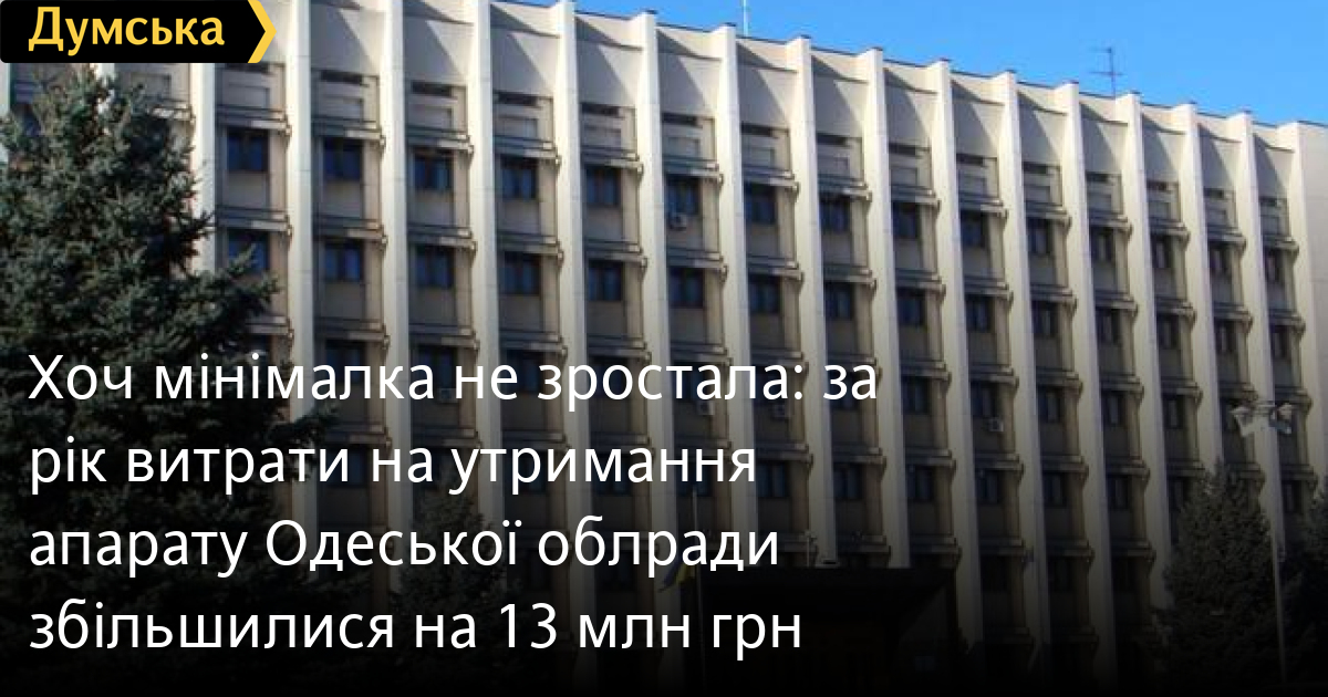 Хоч мінімалка не зростала: за рік витрати на утримання апарату Одеської облради збільшилися на 13 млн грнНа 13 млн гривень збільшився фонд оплати праці співробітників апарату Одеської обласної ради в 2025 році в порівнянні з попереднім. Як стало відомо «Думській» з відповіді на депутатський запит голови «Європейської Солідарності» Михайла Шмушковича, минулого року загальна сума нарахувань склала 54,5 млн гривень, тоді як у 2024-му вона дорівнювала 41,5 млн. При цьому облрада провела лише чотири сесії за весь минулий рік. Із загальної суми посадові оклади становлять понад 10,8 млн грн, надбавки понад 13 млн (з яких 10 млн - за інтенсивність і особливий характер роботи), зате премії досягають майже 21 млн гривень (майже 38% від усього бюджету на зарплати). Найвищі витрати на зарплату, якщо порівнювати по місяцях, були в грудні 2025-го — понад 7,7 млн грн за рахунок високих премій і виплат наприкінці року. Зазначимо, що мінімальна заробітна плата в Україні минулого року не змінювалася і становила 8 тис. гривень, як і в другій половині 2024 року. При цьому витрати на утримання апарату Одеської облради зростають з року в рік. Хоча на початку 2025 року фракція «Європейська Солідарність» пропонувала депутатам заморозити премії та надбавки на період воєнного стану, але коаліція «слуг народу» та ОПЗЖ, яка сформувалася в зборах, не підтримала цю ініціативу. СМЕРТЬ РОСІЙСЬКИМ ОКУПАНТАМ! Помітили помилку? Виділяйте слова з помилкою та натискайте control-enter |