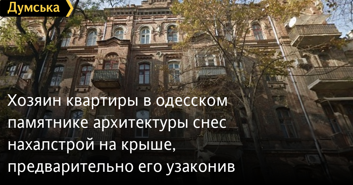 Хозяин квартиры в одесском памятнике архитектуры снес нахалстрой на крыше, предварительно его узаконивВ центре Одессы собственник квартиры снес часть незаконной надстройки на крыше дома-памятника архитектуры по Торговой, 8. Об этом сообщил и.о. начальника муниципального ГАСКа Александр Авдеев. По этому адресу находится еще один доходный дом Руссова, построенный в начале XX века. Как сообщили в ГАСКе, собственник квартиры на последнем этаже решил увеличить свою жилплощадь за счет крыши. В конце сентября хозяин квартиры легализовал свою пристройку и зарегистрировал право собственности на квартиру площадью 90,1 кв.м., хотя до инвентаризации она составляла 41,4 кв.м. «Самое интересное, что на бумаге «курятник» на крыше уже «построен». И, как всегда, портить наш город помогли «черные регистраторы», — сообщил чиновник. Отметим, что часть крышных конструкций все еще виднеется на снимке, предоставленном Авдеевым. Как заверяет чиновник, за спасением дома он обратился во всевозможные инстанции, в том числе — прокуратуру Одесской области. СМЕРТЬ РОСІЙСЬКИМ ОКУПАНТАМ! Помітили помилку? Виділяйте слова з помилкою та натискайте control-enter
