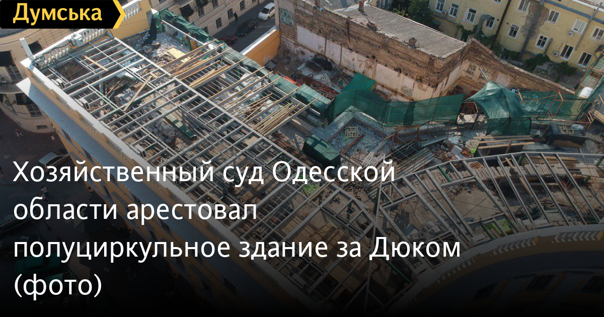 Хозяйственный суд Одесской области арестовал полуциркульное здание, расположенное за левым плечом памятника Дюку де Ришелье, по адресу Приморский бульвар, 7.