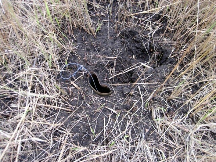 Сейчас на полях, в посадках, в заброшенных селах на Донбассе можно встретить самые разные смертельные «сюрпризы», начиная от банальной растяжки с гранатой Ф-1 и заканчивая подлинными шедеврами саперного искусства. Например, Deca показал нам фотографию фугаса, искусно замаскированного под безобидный пень — только зоркий глаз разведчика может вовремя усмотреть провод.