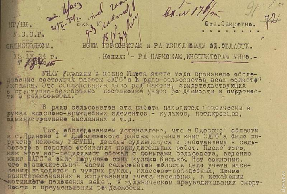 СЕКРЕТНАЯ ДИРЕКТИВА ОДЕССКОГО ОБЛИСПОЛКОМА ГОРОДСКИМ СОВЕТАМ И РАЙОННЫМ ИСПОЛКОМА ОДЕССКОЙ ОБЛАСТИ, 13 АПРЕЛЯ 1934 ГОДА: