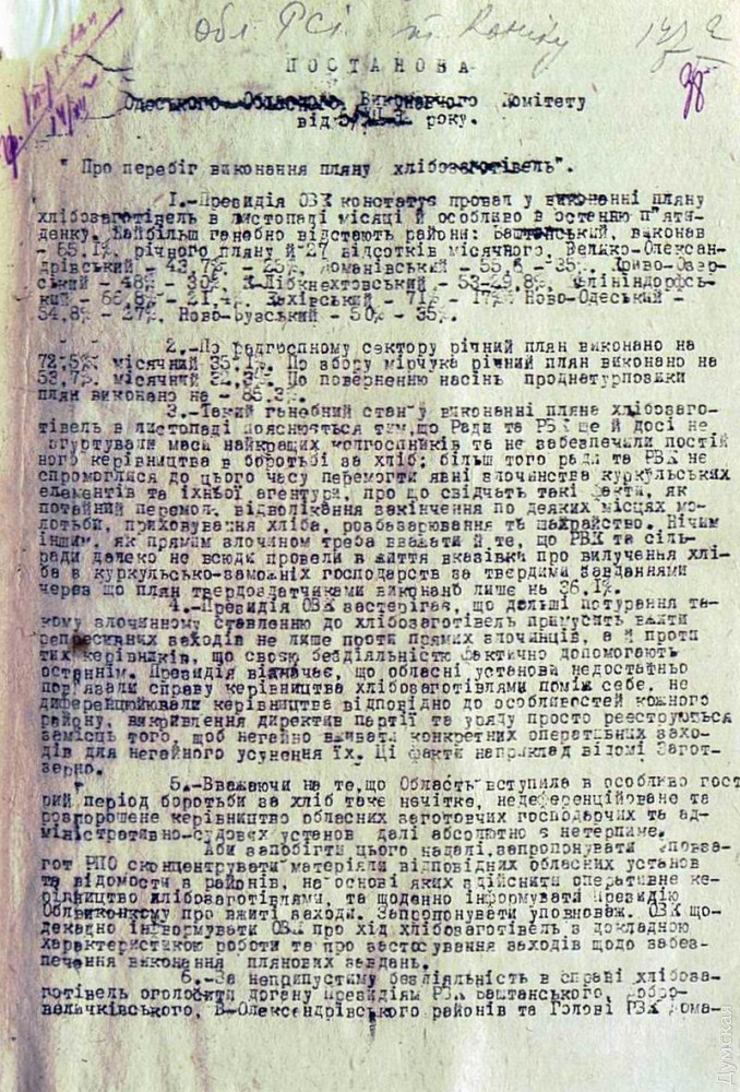 ПОСТАНОВЛЕНИЕ ОДЕССКОГО ОБКОМА КП(Б)У ОБ УСИЛЕНИИ БОРЬБЫ С ПРОДАЖЕЙ ХЛЕБА И КОНФИСКАЦИЕЙ ЕГО НА РЫНКАХ, 18 НОЯБРЯ 1932 ГОДА: