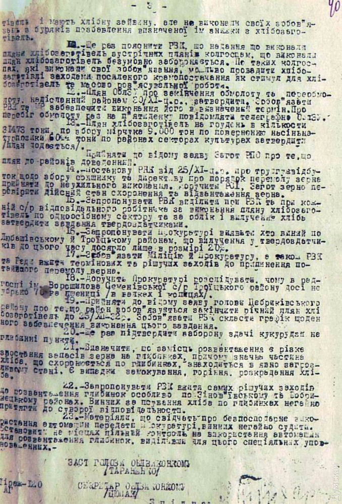 1. Обязать Областной отдел Объединенного Главного Политического Управления дать директиву начальникам районных отделений и районным уполномоченным ГПУ - о всемерном усилении борьбы с продажей зерна, муки и большого количества выпеченного хлеба (более пуда) колхозниками и единоличниками, конфискации на базарах привезенного зерна, муки и выпеченного хлеба.