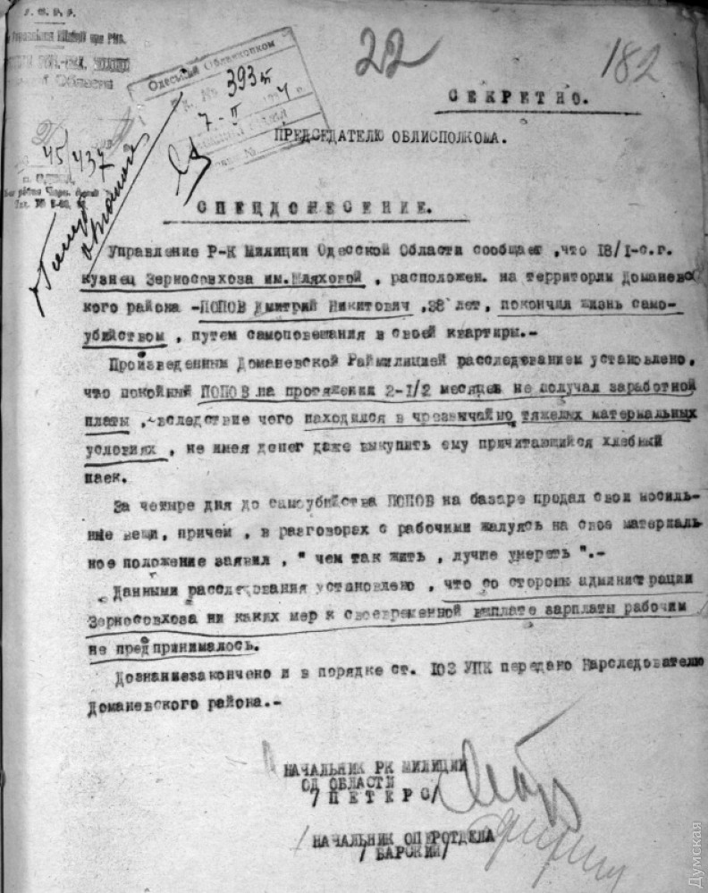 «18 января сего года кузнец Зерносовхоза имени Шляховой, расположенного на территории Доманевского района, Попов Дмитрий Никитович, 38 лет, покончил жизнь самоубийством путем самоповешения в своей квартире. Произведенным доманевской раймилицией расследованием установлено, что покойный Попов на протяжении двух с половиной месяцев не получал заработной платы, вследствие чего находился в чрезвычайно тяжелых материальных условиях, не имея денег даже выкупить причитающийся ему хлебный паек».