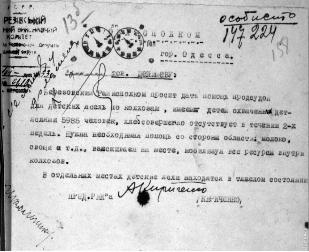 Я вважаю, що необхідна негайна продуктова допомога не тільки для робітників та службовців, а насамперед для партактиву міста, який декілька місяців не одержує хліб — купують на базарі макуху, яка коштує понад 30 крб. (рублей, — Ред.), і навіть в постачанні її є перебої. Для декласованого елементу відкрито їдальню та майстерню — «Труд-допомога», але ж цього зовсім замало. Я гадаю, що ти вживеш необхідних заходів».