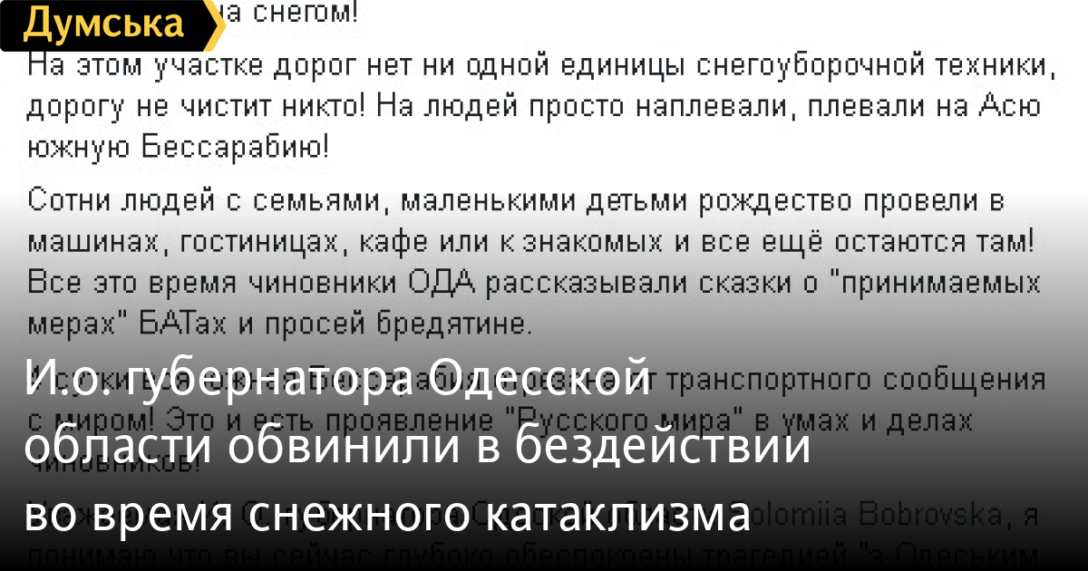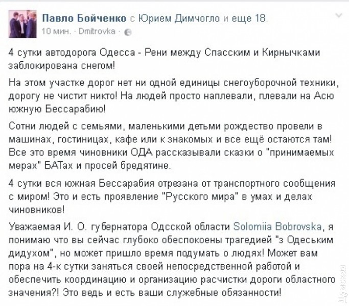 «4 сутки вся южная Бессарабия отрезана от транспортного сообщения с миром! Это и есть проявление «Русского мира» в умах и делах чиновников! Уважаемая И. О. губернатора Одсской области Соломия Бобровская, я понимаю что вы сейчас глубоко обеспокоены трагедией «з Одеським дидухом», но может пришло время подумать о людях! Может вам пора на 4-е сутки заняться своей непосредственной работой и обеспечить координацию и организацию расчистки дороги областного значения?! Это ведь и есть ваши служебные обязанности!», — написал Бойченко на своей странице в Фейсбуке.