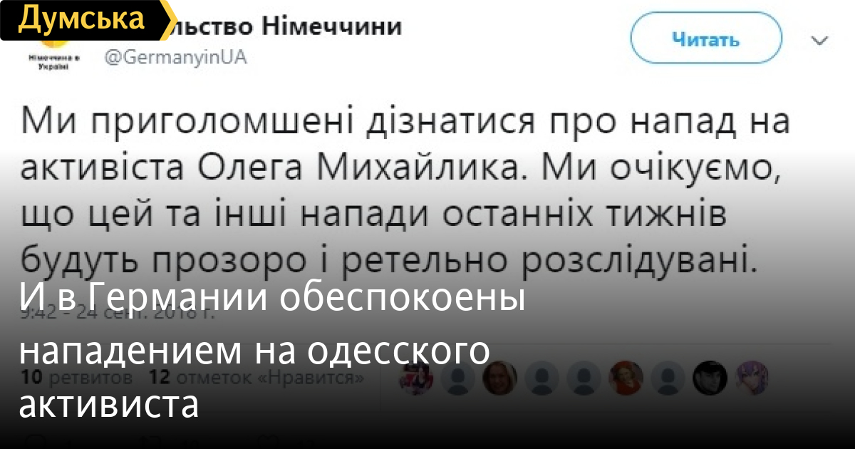 Посольство ФРГ ожидает тщательного расследования нападения на одесского общественного деятеля Олега Михайлика.