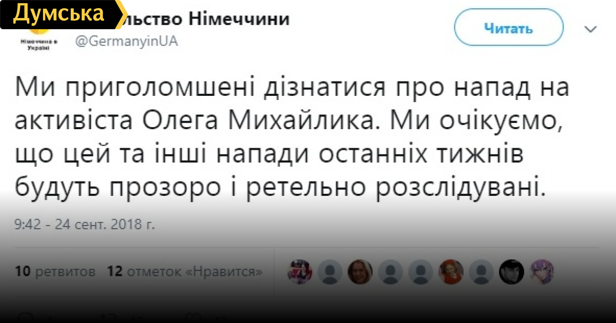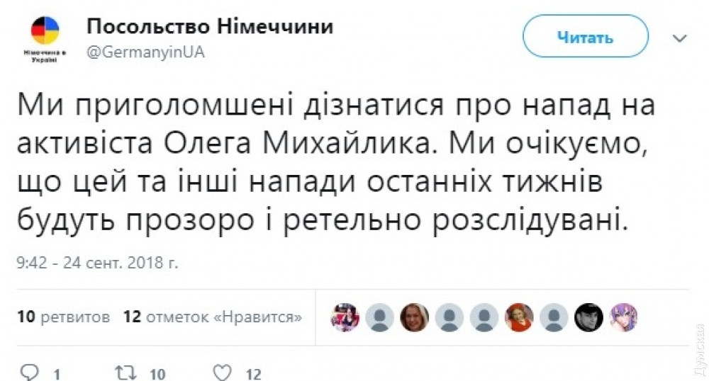 «Мы потрясены новостью о нападении на активиста Олега Михайлика. Мы ожидаем, что это и другие нападения, совершенные в течение последних недель, будут прозрачно и тщательно расследованы», — говорится в сообщении немецких дипломатов.