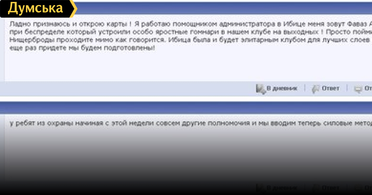 В дальнейшем Menfis написал, что его зовут Фараз Арабаджи, что он помощник администратора «Ибицы» и присутствовал во время попыток сотрудников клуба выгнать одесситов: «Я присутствовал при беспределе который устроили особо яростные гомнари в нашем клубе на выходных! Просто поймите ВАМ не место у нас. Нищерброды проходите мимо как говорится. Ибица была и будет элитарным клубом для высших слоев населения. А вы щенки еще раз придете мы будем подготовлены!» [орфография сохранена — ред.]
